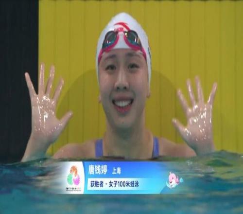 女子100米蛙泳:上海选手唐钱婷游出1分05秒36,夺得金牌