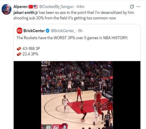 火箭队居然被国王队狂胜13分,在萨克门托遭到双杀,国王7连败之前赢下的球队就是火箭,7连败后赢下的球队还是火箭。休斯顿火箭队在短短一周里从西部第三下滑到西部第七,小贾巴里-史密斯成为休媒公敌。